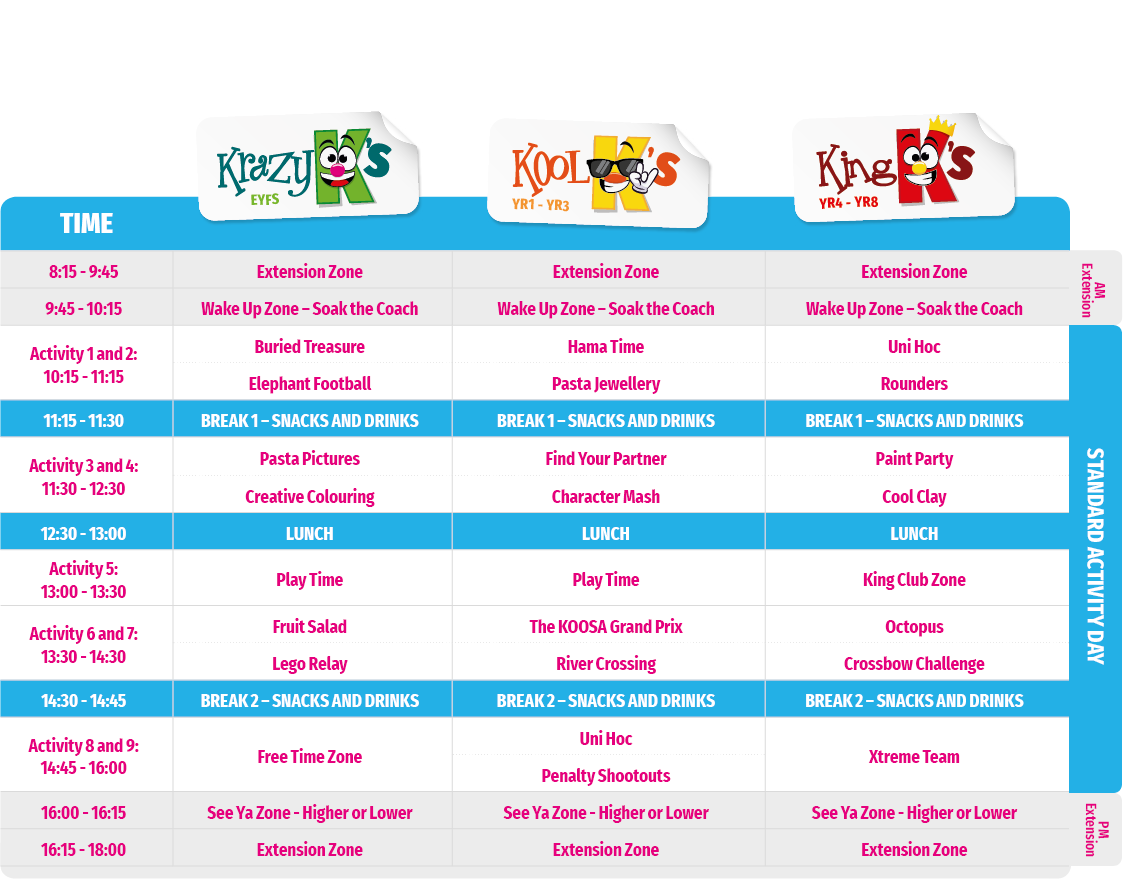 In order for your child to get the most out of their time at KOOSA Kids holiday clubs, they will be grouped based on their school year.
